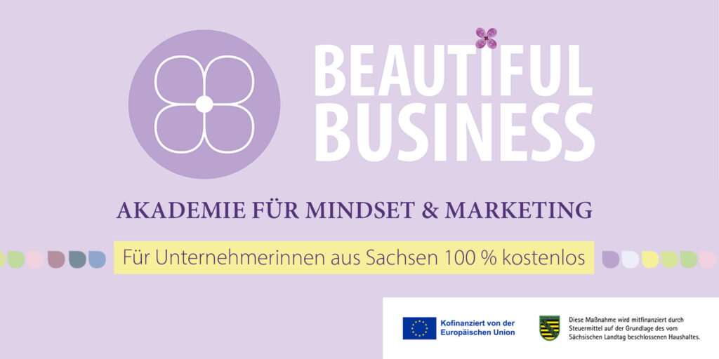 All diese Fragen – und noch viele, viele mehr – beantworten wir gemeinsam in unserem 10-monatigen Business-Mentoring-Programm BEAUTIFUL BUSINESS – Akademie für Mindset & Marketing. Und das Beste daran ist: Als Unternehmerin aus Sachsen kostet dich das keinen Cent!